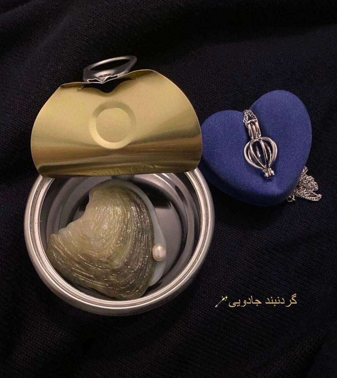 زنجیر استیل رنگ ثابت داخل کنسرو صدف طبیعی داخل ان مروارید پرورشی