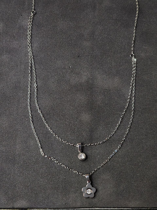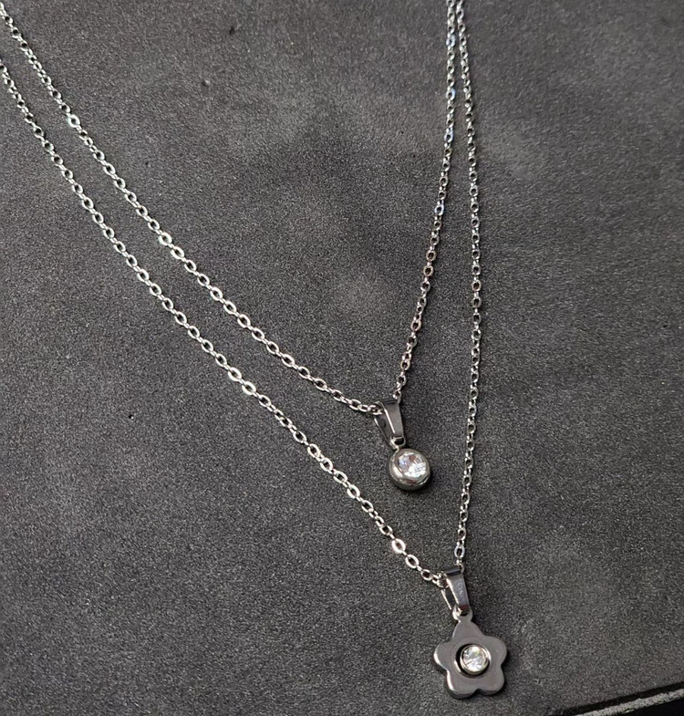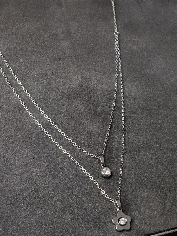 گردنبند استیل دو لاین نقره ای تک نگین گل